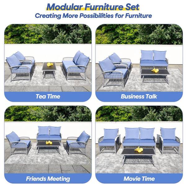 4-Piece Metal Outdoor Sofa Sectional Set Patio Furniture Set Conversation Set with Blue Cushions