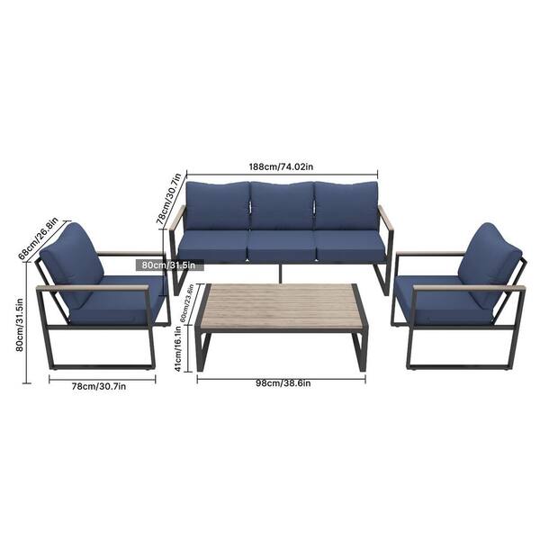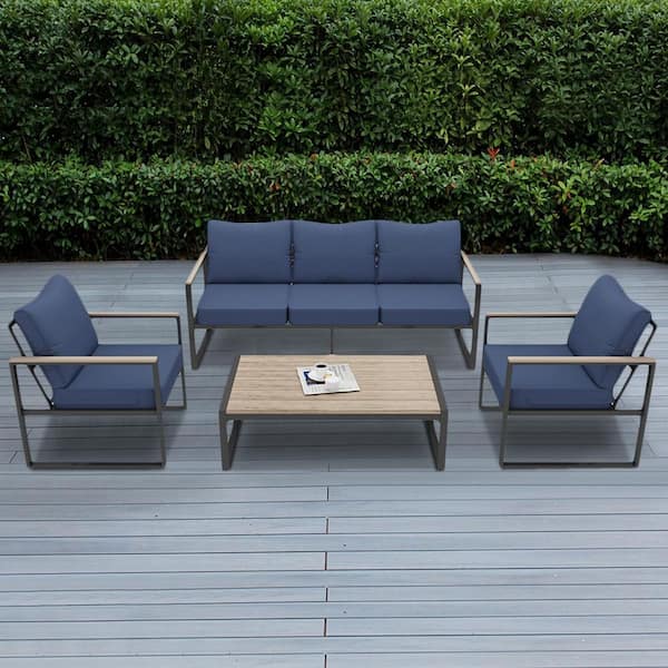 4-Piece Metal Outdoor Sofa Sectional Set Patio Seating Sets Conversation Sets with Blue Cushions