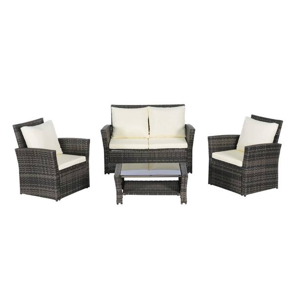 4-Piece Wicker Patio Conversation Set with Beige Cushions, Tempered Glass Coffee Table