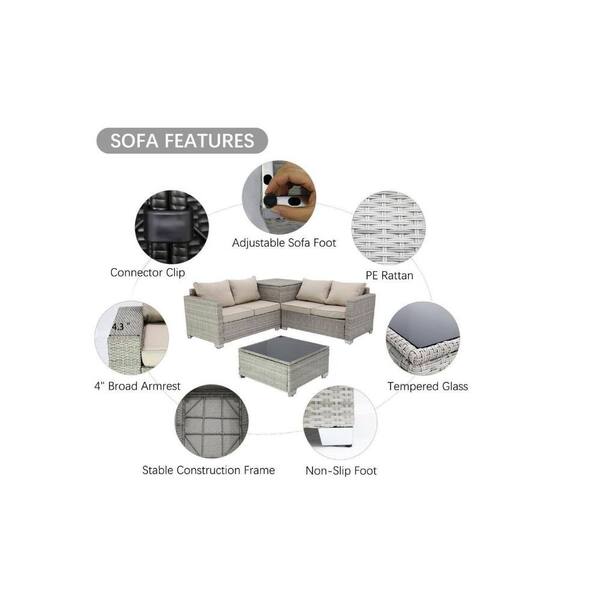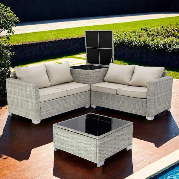 4-Piece Wicker Patio Conversation Set with Gray Cushions, Large Storage Box and Glass Table