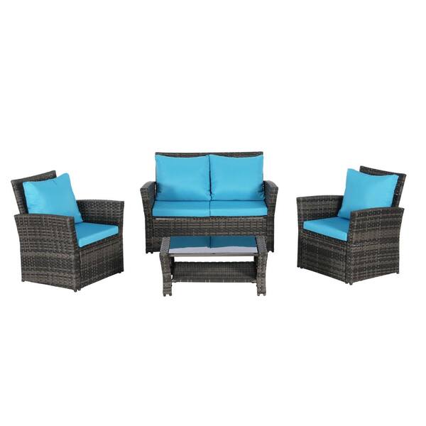 4-Piece Wicker Patio Conversation Set with Light Blue Cushions, Tempered Glass Coffee Table