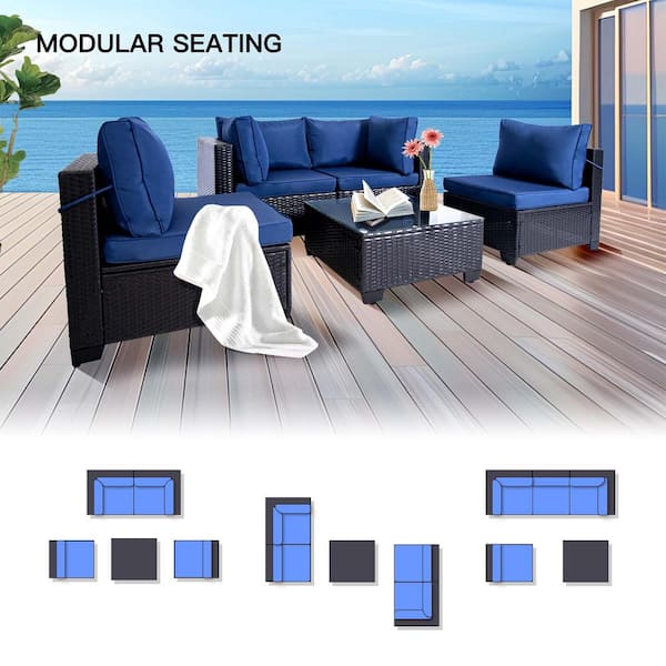 5-Piece Black Wicker Patio Conversation Set with Blue Cushions