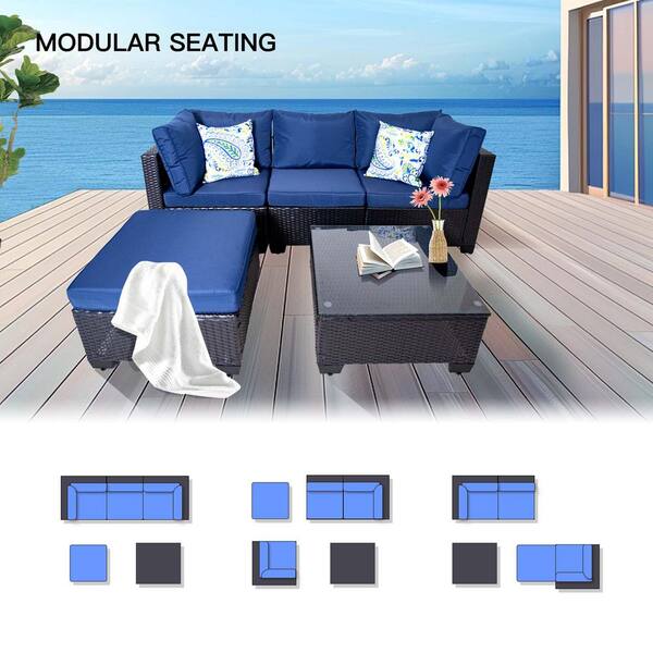 5-Piece Black Wicker Patio Conversation Set with Blue Cushions