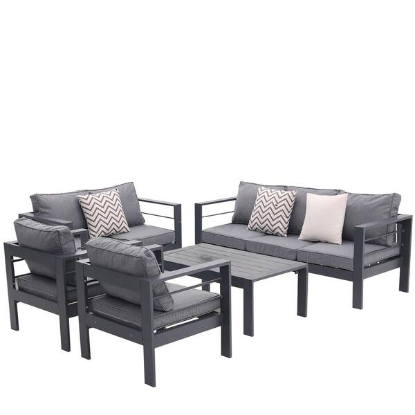 5-Piece Grey Metal Patio Conversation Set with Removable Gray Cushions and Tempered Glass Coffee Table