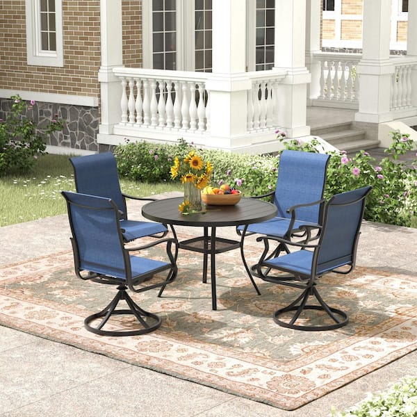 5-Piece Metal Outdoor Dining Set with Storage Shelf, Walnut Tabletop, Umbrella Hole, Dark Blue Seats