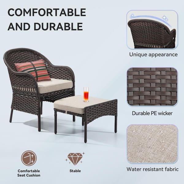 5-Piece Wicker Patio Conversation Set Sofa Set with Beige Cushions, Ottomans and Side Table