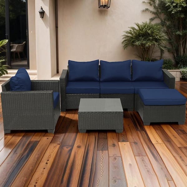 6-Piece Dark Brown Wicker Patio Conversation Set with Dark Blue Cushions