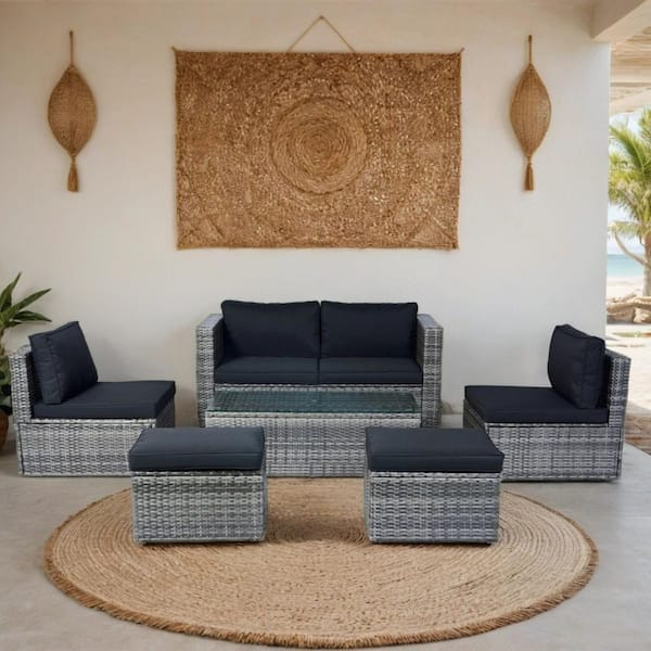 6-Piece Wicker Outdoor Sofa Sectional Set Conversation Set with Black Cushions, Smart Storage Design