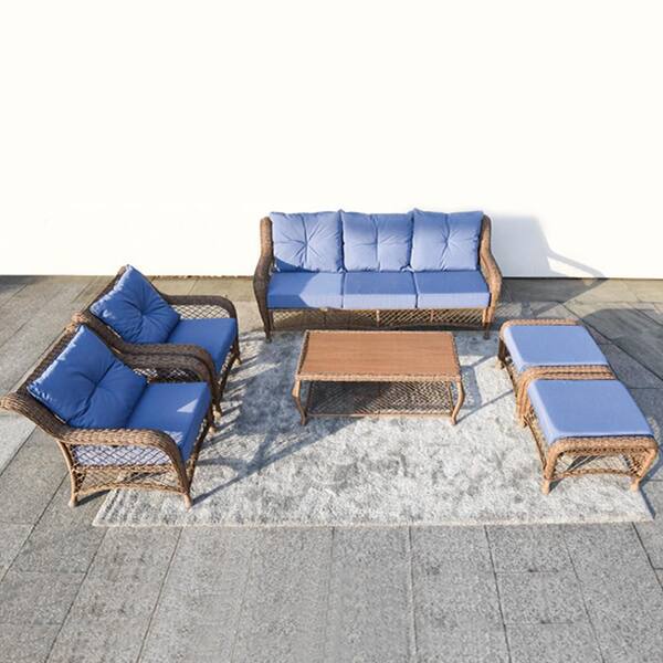 6-Piece Wicker Outdoor Sofa Sectional Set Patio Furniture Set Conversation Set with Blue Cushions