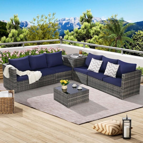 6-Piece Wicker Patio Conversation Set with Dark Blue Cushions, Corner Table and Glass Top Table