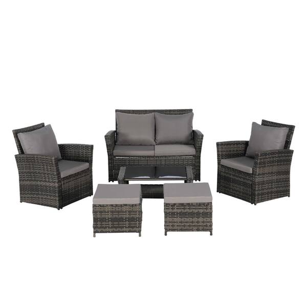 6-Piece Wicker Patio Conversation Set with Dark Gray Cushions, Ottoman and Tempered Glass Coffee Table