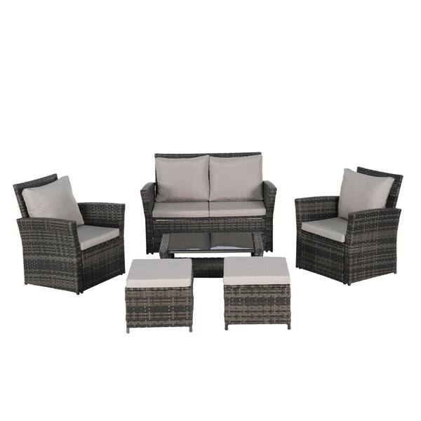 6-Piece Wicker Patio Conversation Set with Light Gray Cushions, Ottoman and Tempered Glass Coffee Table