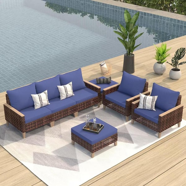 7-Piece All-Weather Wicker Outdoor Sofa Sectional Set with Blue Cushions