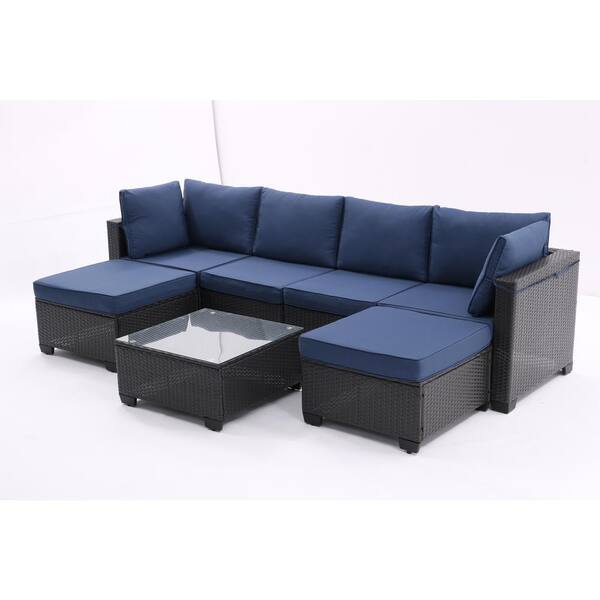 7-Piece Black Wicker Patio Conversation Set with Blue Removable Cushions, Ottomans, Glass Top Table