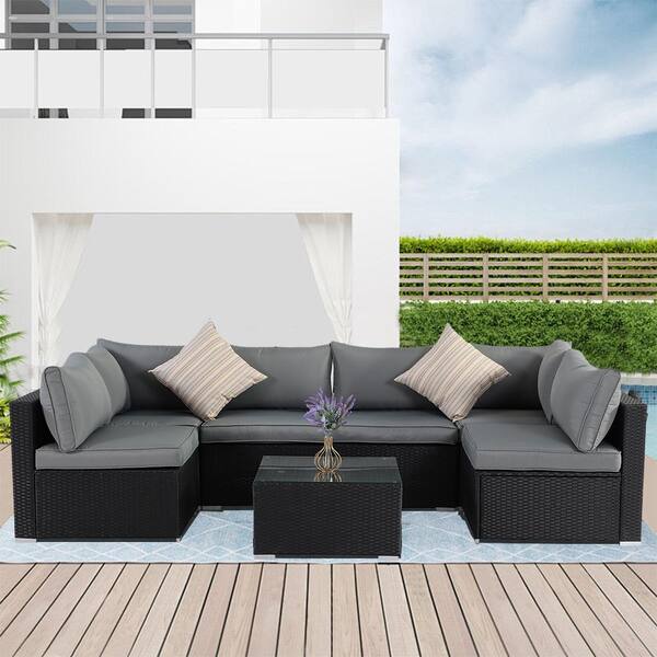 7-Piece Black Wicker Patio Conversation Set with Gray Cushions