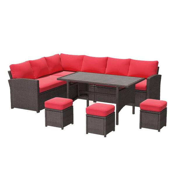 7-Piece Brown Wicker Outdoor Dining Set with Red Cushions