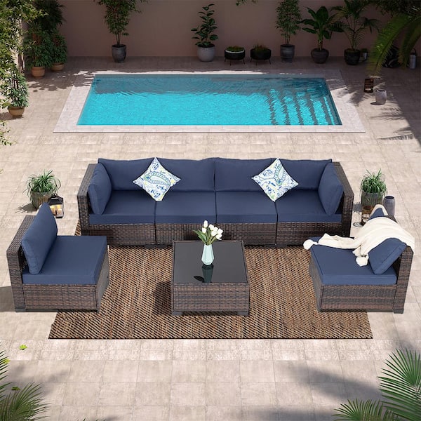 7-Piece Brown Wicker Patio Conversation Set with Blue Cushions