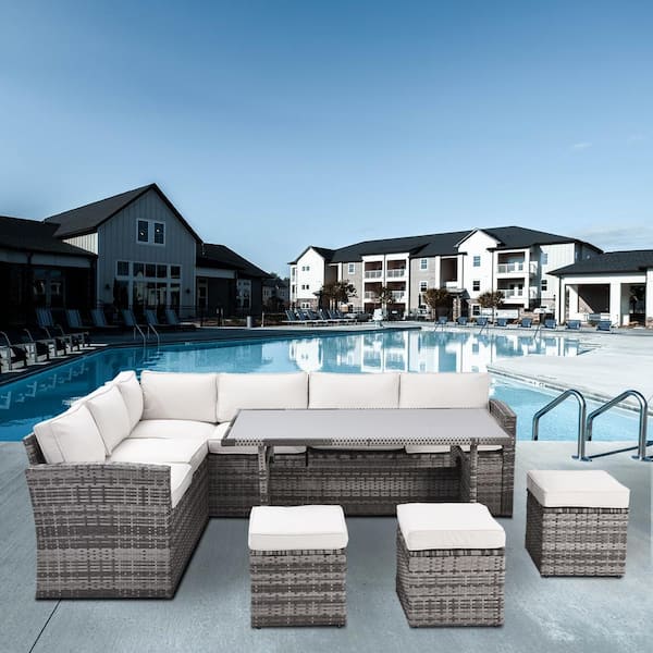 7-Piece Gray All Weather PE Wicker Patio Conversation Set with Beige Removable Cushions, Chairs, Ottomans, Backrest