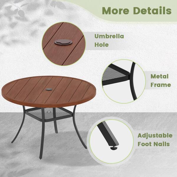 7-Piece Metal Outdoor Dining Set with Storage Shelf, Walnut Tabletop, Umbrella Hole, Black Seats