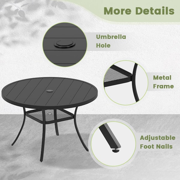 7-Piece Metal Outdoor Dining Set with Storage Shelf, Walnut Tabletop, Umbrella Hole, Brown Seats