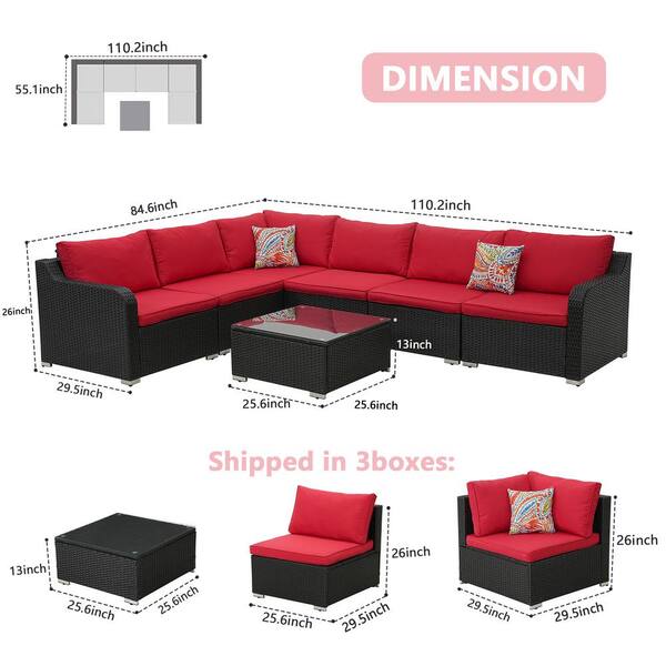 8-Piece Black Wicker Patio Conversation Set with Red Cushions, 28 in. Propane Fire Table, Lid, Glass Wind Guard