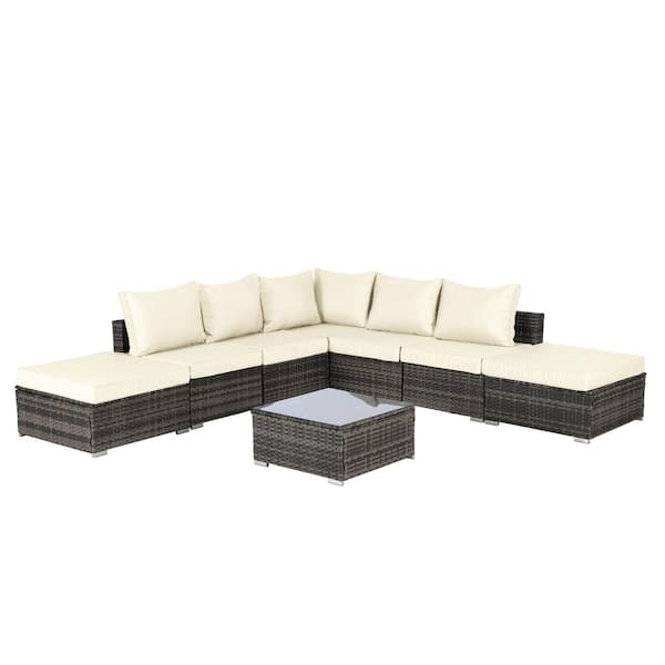 8-Piece Wicker Patio Conversation Set with Beige Cushions, Glass Coffee Table