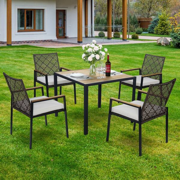 All Weather 5-Piece Wicker Outdoor Dining Set Patio Conversation Set with Light Gray Cushions and 2.44 in. Umbrella Hole