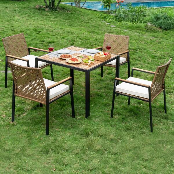 All Weather 5-Piece Wicker Outdoor Dining Set Patio Conversation Set with White Cushions and 2.44 in. Umbrella Hole