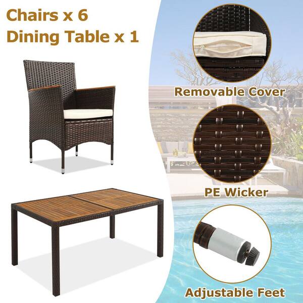 Brown Frame 7-Piece Wicker Outdoor Dining Set with Beige Cushions, Brown Acacia Wood Tabletop