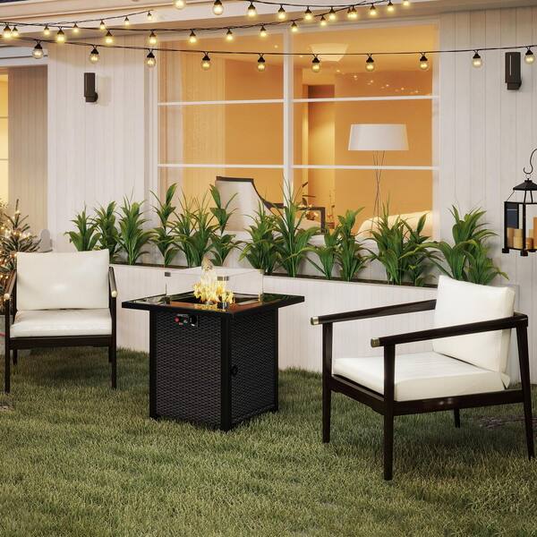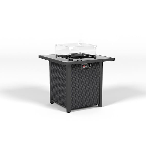 Coffee Square Wicker Propane Fire Pit Table with Glass Windscreen Protector, Tempered Glass Tabletop