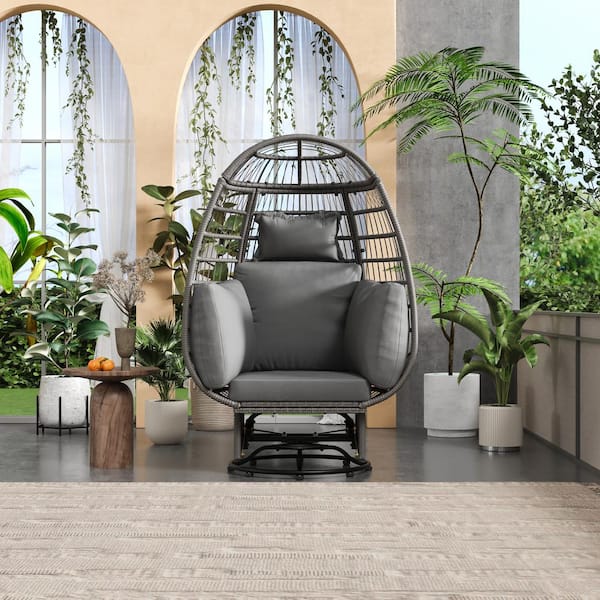 Gray Wicker Rattan Egg Swivel Outdoor Lounge Chair with Gray Cushions Rocking Function