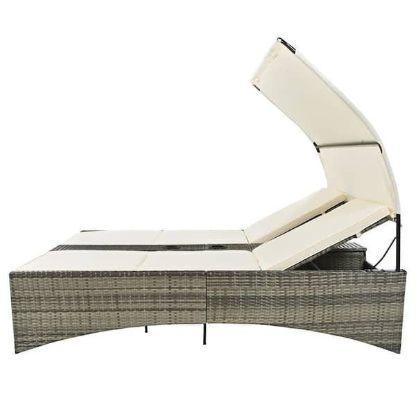 Metal and Rattan Outdoor Adjustable Backrest Day Bed Set with Shelter Roof and Cream Cushions