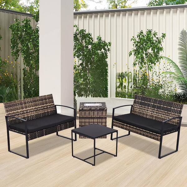 Natural 4-Piece PE Rattan Wicker Outdoor Conversation Loveseat Set with Black Cushions, Table and Ice Bucket Storage Box
