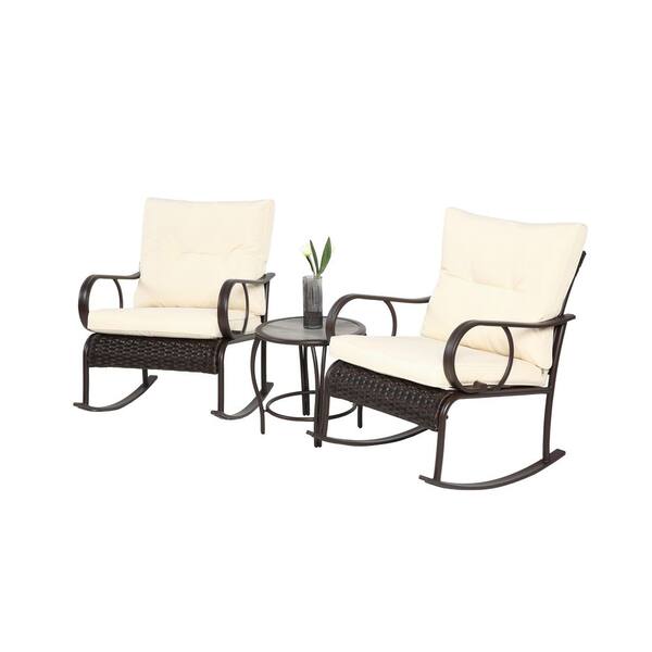 Outdoor 3-Piece Metal Rocking Bistro Patio Conversation Set with White Cushions