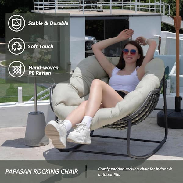 Rattan Rope 37 in. W Metal Outdoor Rocking Chair with Beige Olefin Cushion
