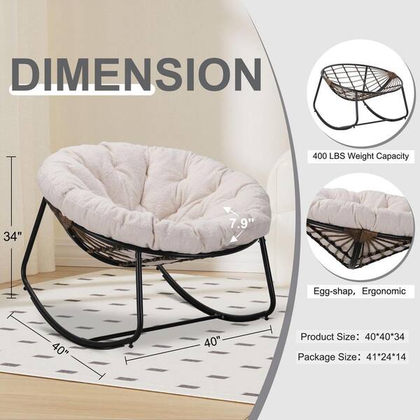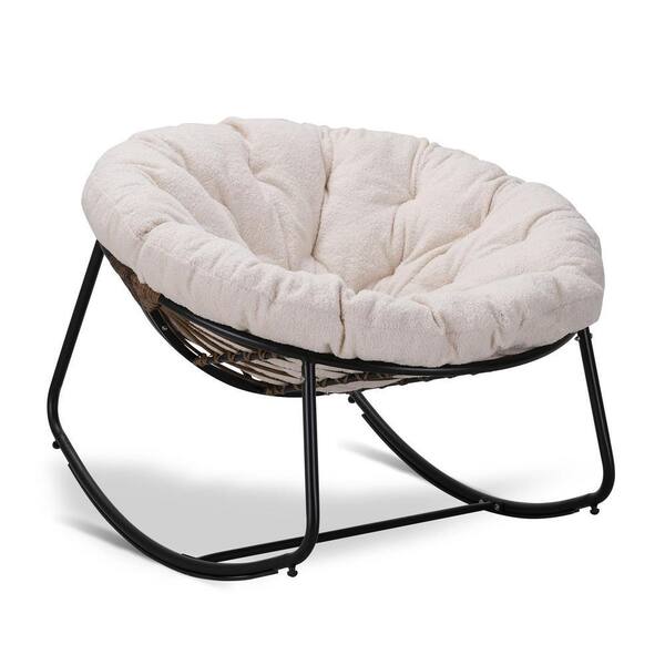 Rattan Rope Dark Gray Frame 40 in. W Metal Outdoor Rocking Chair with Beige Teddy Cushion