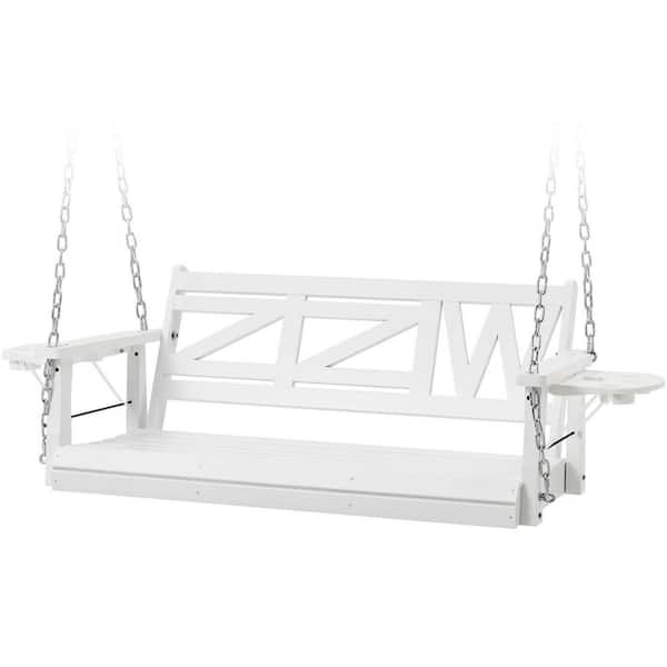 White 2-Person Wood Porch Swing Hanging Swing with Foldable Cup Holders and Chains