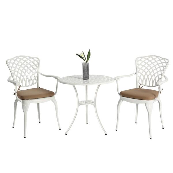 White 3-Piece Rust-Resistant Aluminum Outdoor Bistro Set Dining Set with Tan Cushion and Umbrella Hole