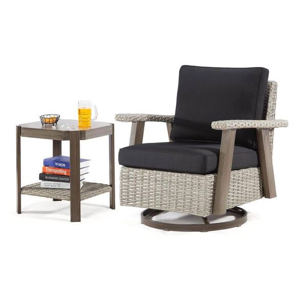 Wicker Swivel Outdoor Lounge Chair with Black Cushions, Side Table