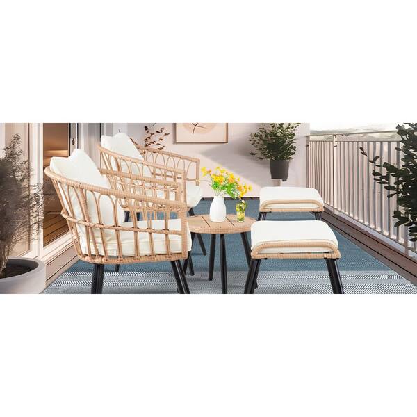 Yellow Wicker Outdoor Lounge Chair with Beige Cushions (5-Pack) Rattan Round Table