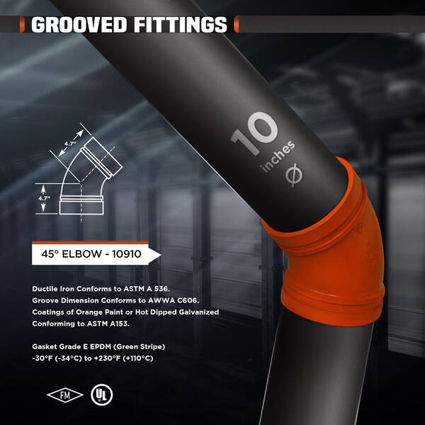 10 in. Ductile Iron 45-Degree Grooved Elbow Fitting, Joins Pipes in Wet and Dry Systems, Full Flow, Orange