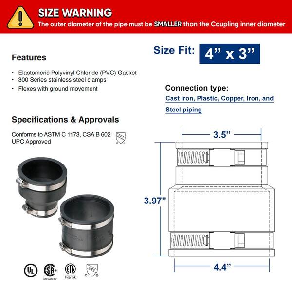 4 in. x 3 in. PVC Flexible Reducing Coupling with Stainless Steel Clamps