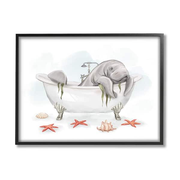 Manatee Sea Life Swimming Bathtub Bathroom Painting Design By Ziwei Li Framed Typography Art Print 14 in. x 11 in.