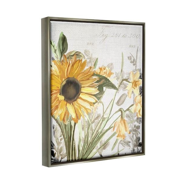 Soft Sunflower Floral over Vintage Plant Illustration by Kim Allen Floater Frame Nature Wall Art Print 31 in. x 25 in.
