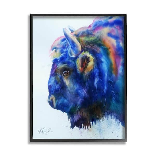 Unique Vibrant Blue Bison Painting Bold Design by MB Cunningham Framed Animal Art Print 14 in. x 11 in.