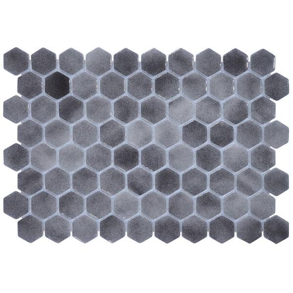 • Glossy grey mix hex tile offers sleek, modern style.