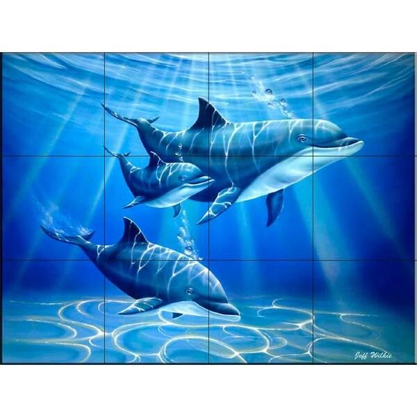 Dolphin Journey 17 in. x 12-3/4 in. Ceramic Mural Wall Tile