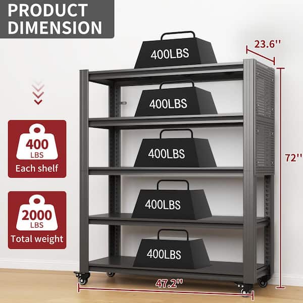 5 Tiers Metal Adjustable Heavy Duty Garage Storage Shelving Unit in Silver with Wheel (47 in. W x 72 in. H x 23.6 in. D)