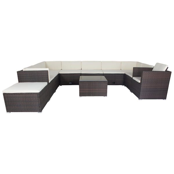 Brown 11-Piece Wicker Patio Conversation Set with White Cushion and 3 Storage Box
