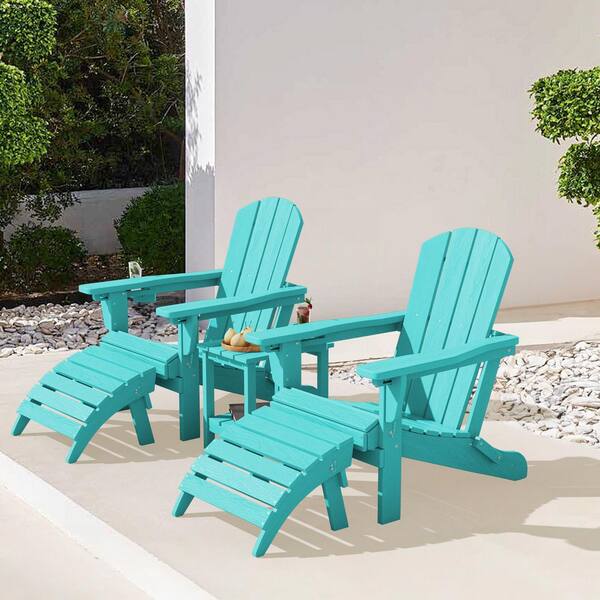 Tiffany Blue Outdoor 5-Piece HDPE Plastic Patio Chat Set, 2-Adirondack Chairs with Side Table and 2-Folding Ottomans